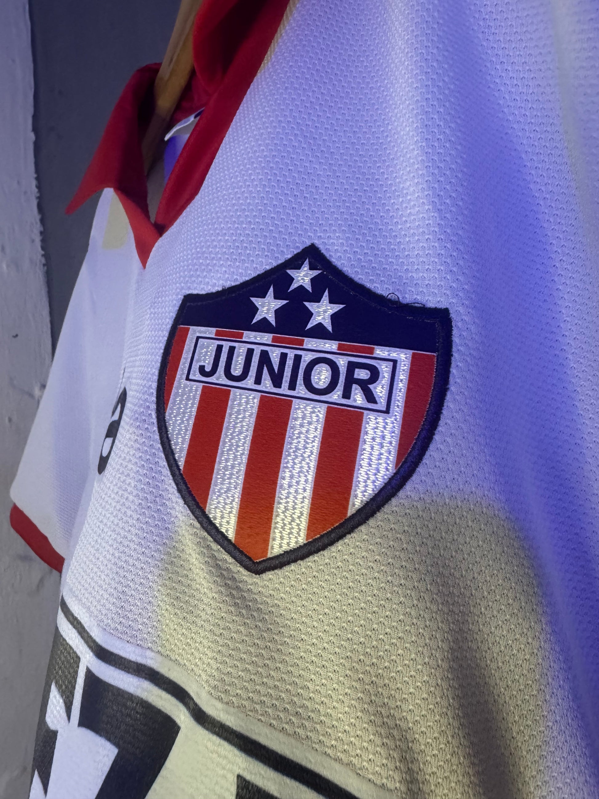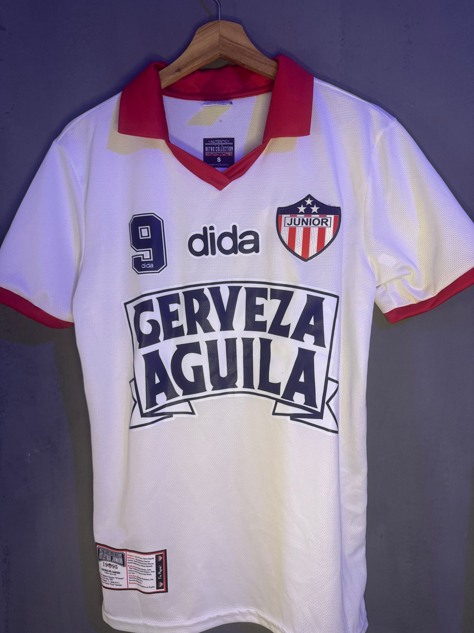 Incluye el dorsal plastificado número 9 de Iván René Valenciano, el máximo goleador del Junior. Un número que no representa solo a un jugador, sino una era completa de celebraciones en Barranquilla.