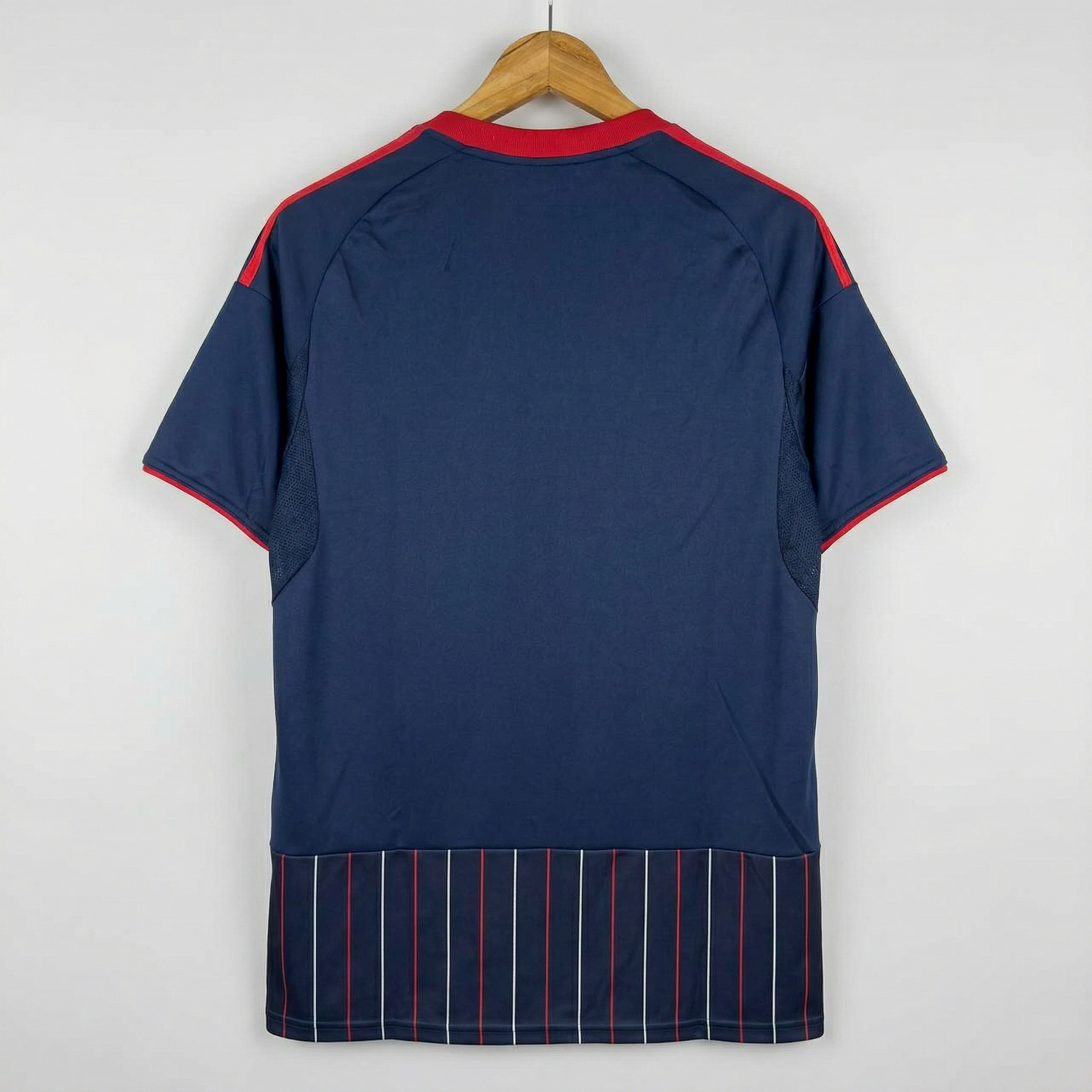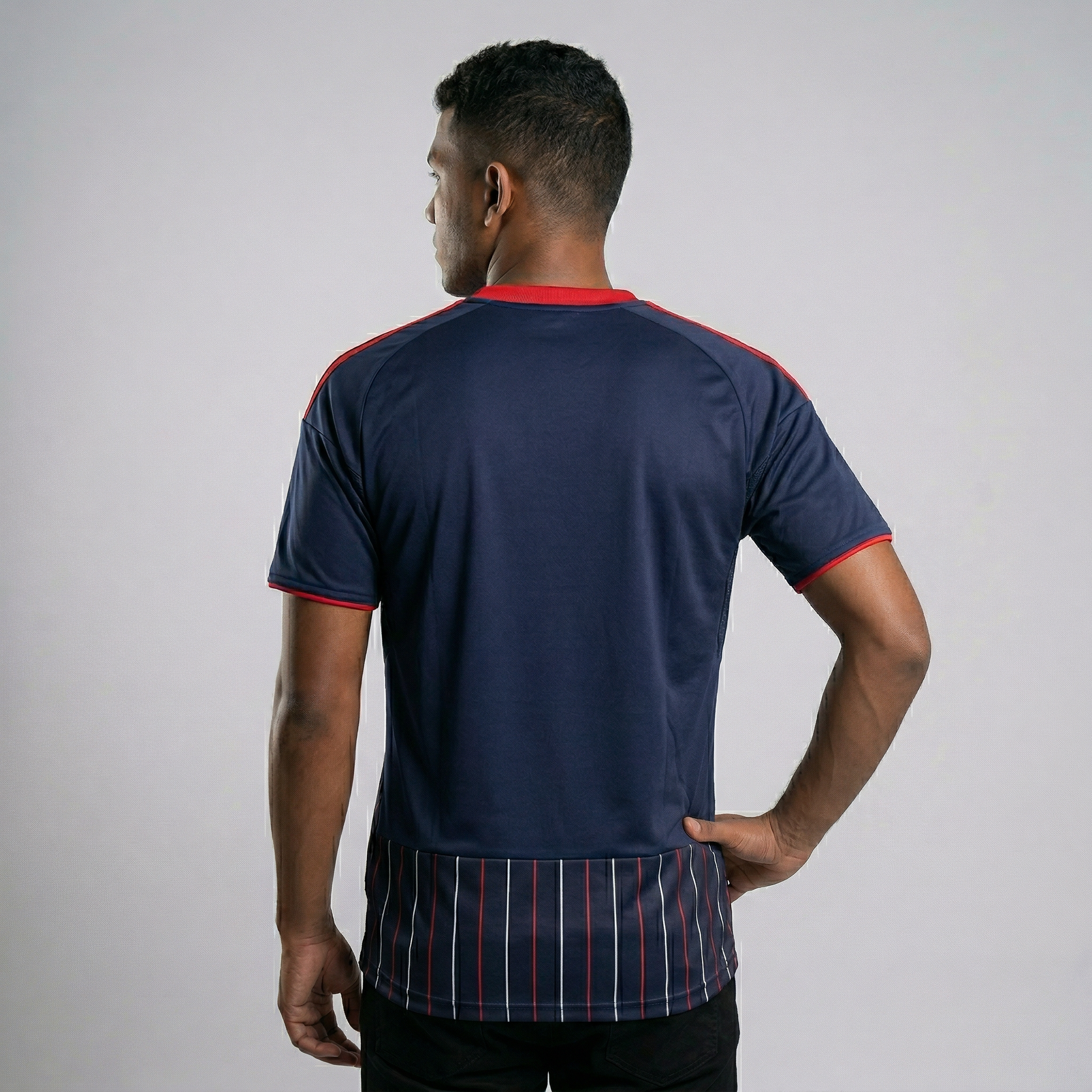 Base azul profunda con patrones en líneas blancas y rojas que estilizan la silueta y aportan identidad. No es solo estética, es presencia. Es la diferencia entre llevar una camiseta cualquiera y vestir algo con intención.