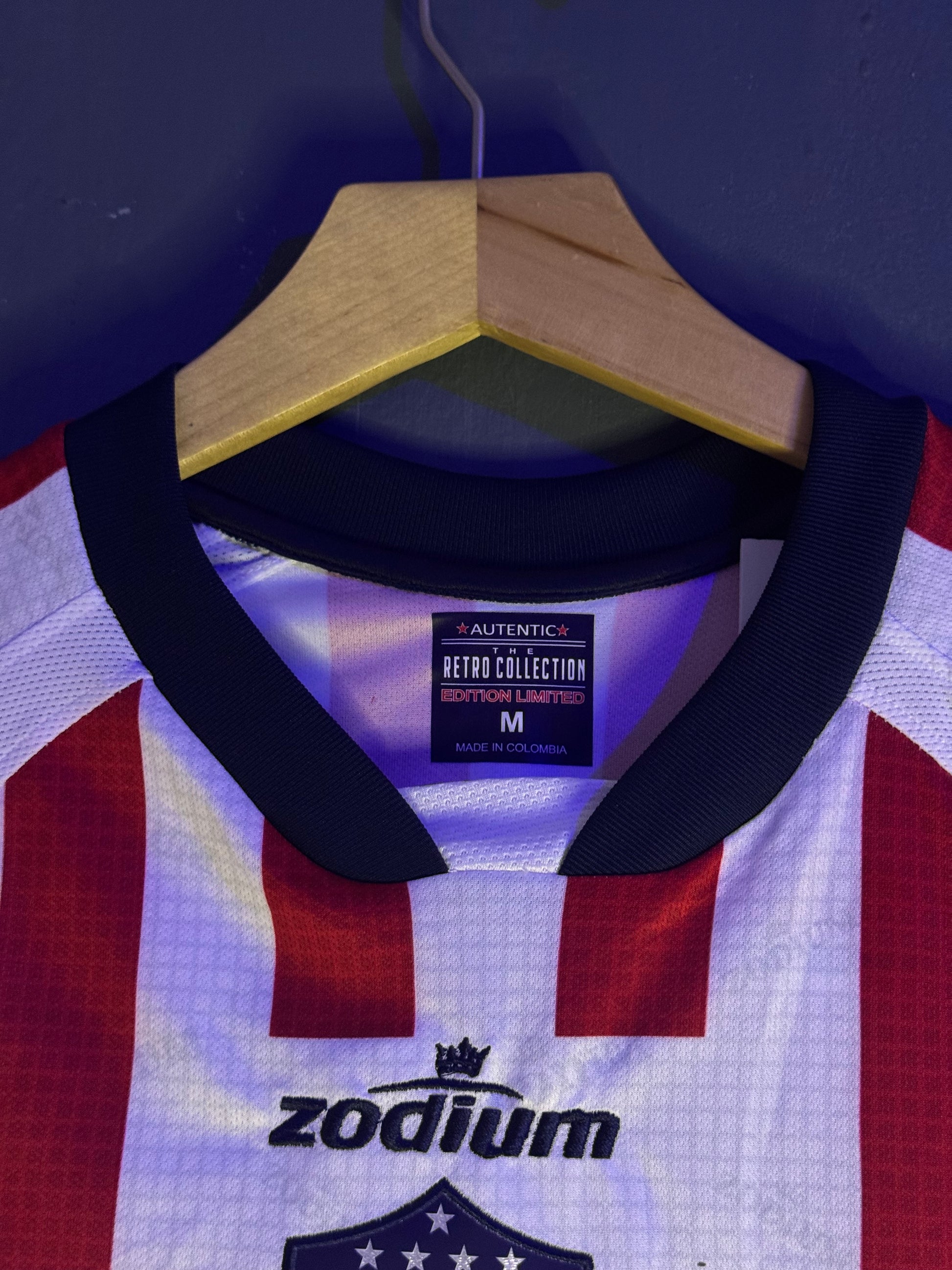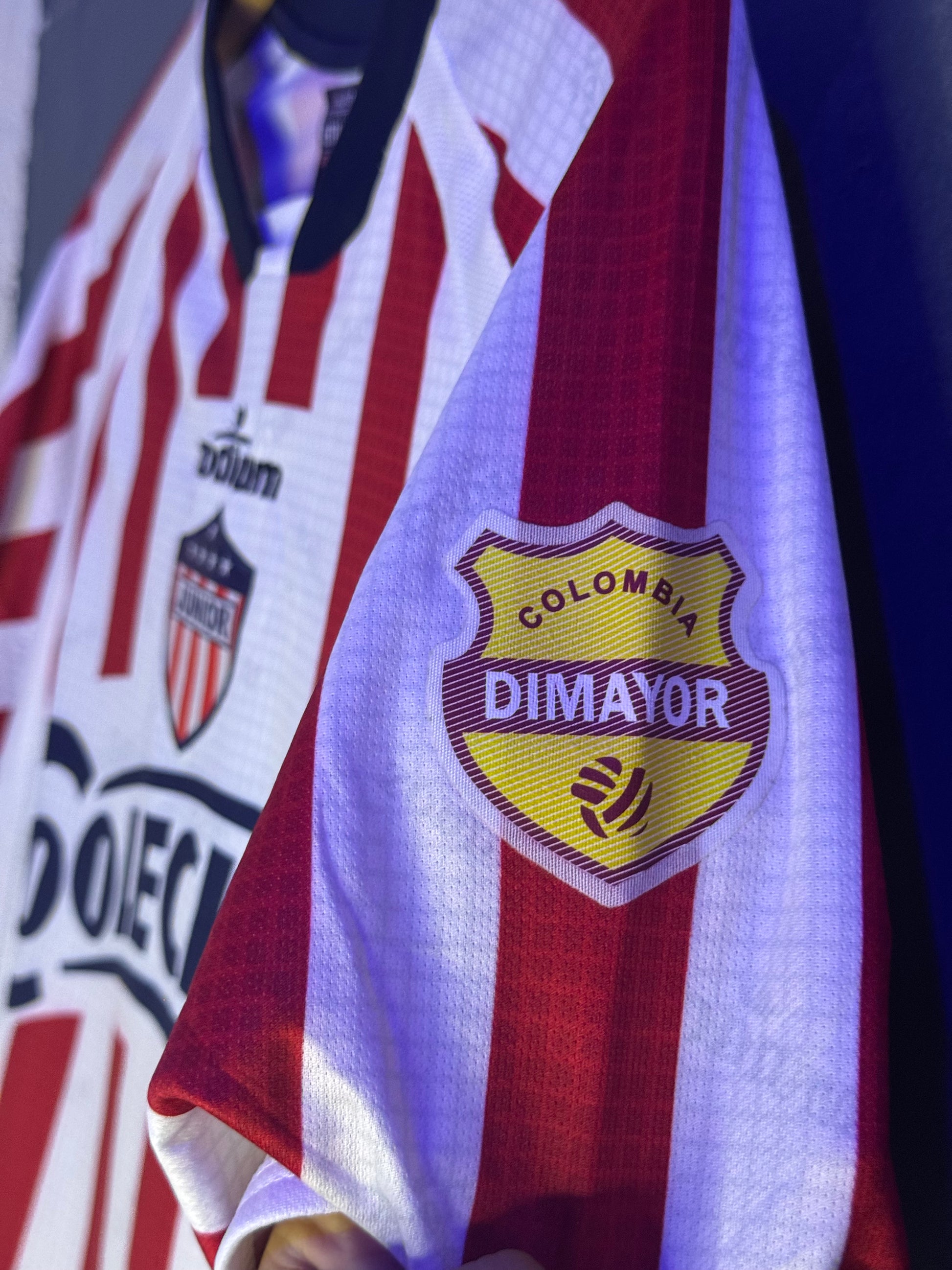 Camisa del Junior año 2006 🔴⚪, un clásico con franjas finas verticales y cuello redondo en azul marino 💙. Escudo y logos completamente bordados 🪡 para mayor durabilidad, con la recordada publicidad de Colechera al frente 🥛. Una pieza histórica para los hinchas tiburones 🦈 que evoca esas temporadas inolvidables en el Metropolitano 🏟️.