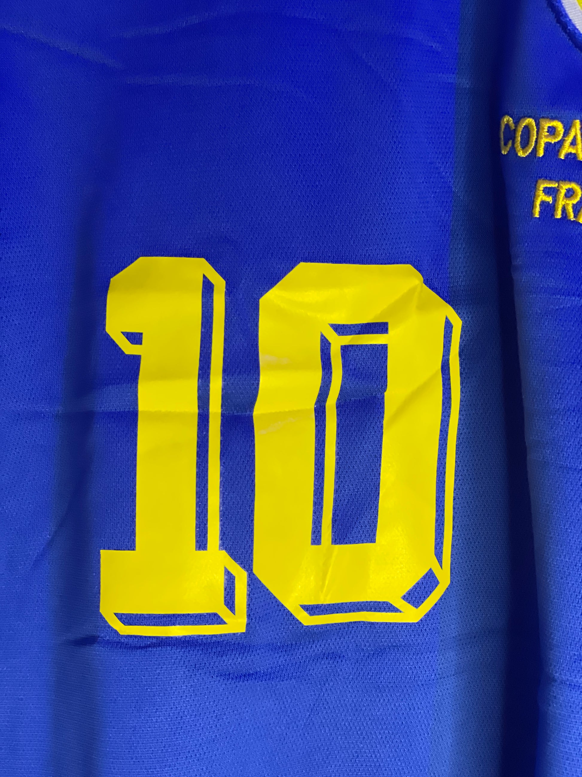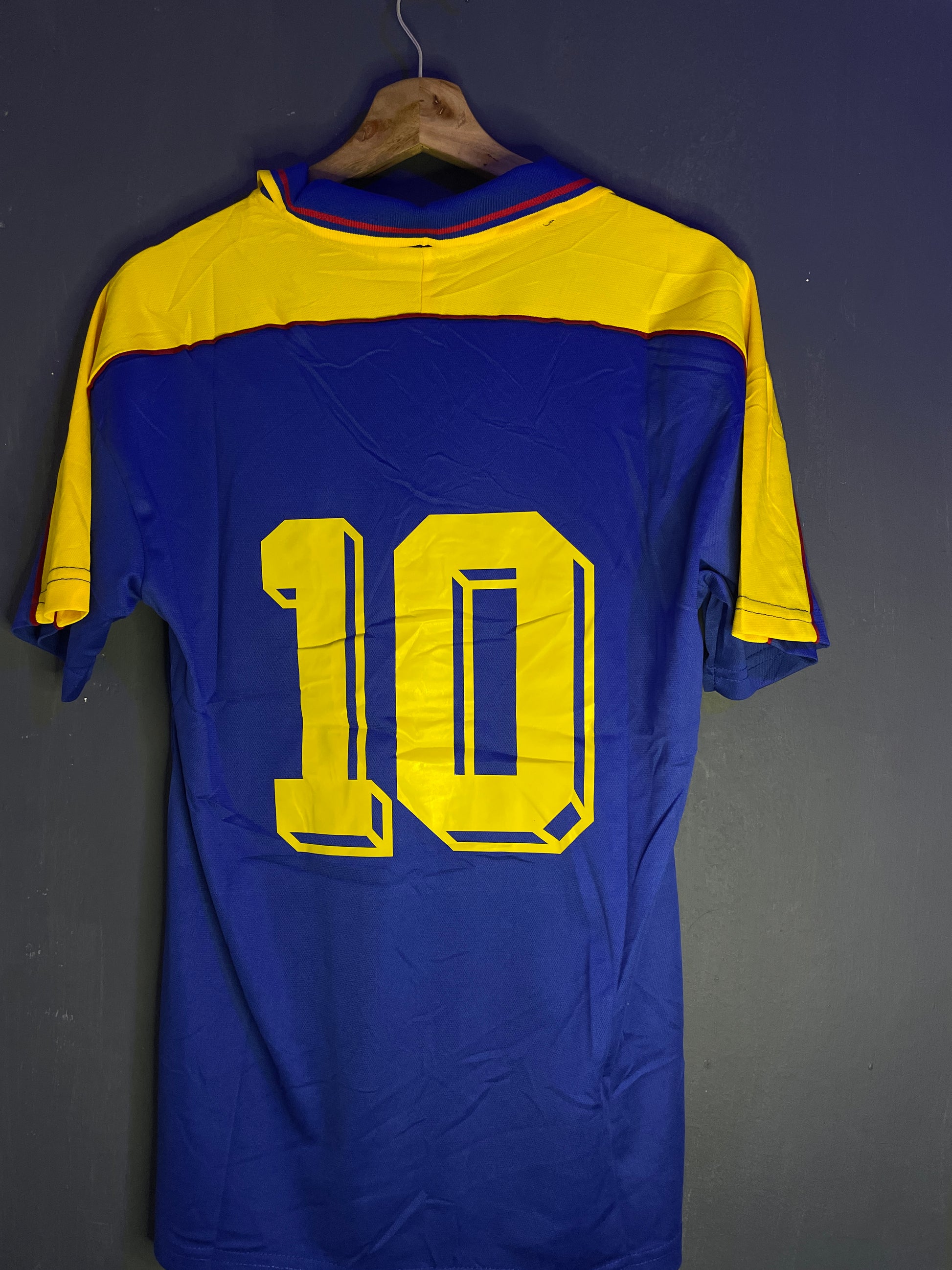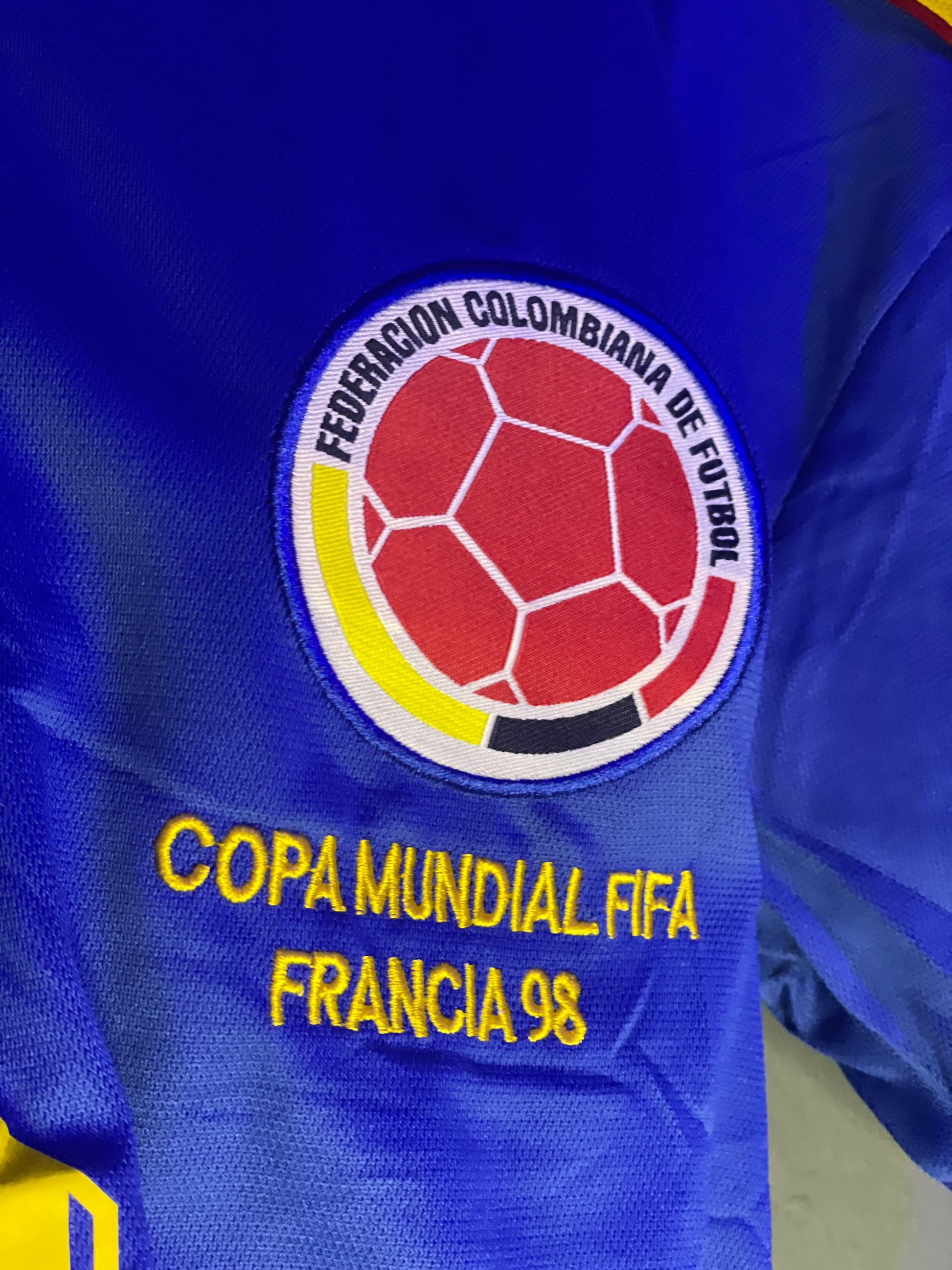 amiseta de la Selección Colombia 💛💙❤️ versión alternativa azul del Mundial de Francia 1998 🌍⚽. Marca Reebok, con diseño clásico que marcó época, cuello con detalles en amarillo y rojo 🔥. El escudo de la Federación y el logo Reebok vienen bordados 🧵✨, tal como en la original usada por los jugadores en la cita mundialista. Una prenda histórica 🇨🇴, perfecta para coleccionistas y amantes del fútbol retro 🏆⚡.